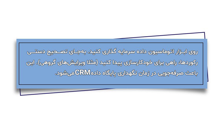 ارزش یک سیستم CRM به داشتن دادههای قابل اعتماد و با کیفیت است. هنگامی که دادههای زیادی با سرعت بالا وارد سیستم میشوند، این دادهها باید حفظ شوند تا در شرایط مختلف کسب و کار استفاده شوند. همچنین باید برای کسانی که به آن نیاز دارند قابل دسترسی باشند، و برای کشف فرصتهای تجاری جدید مناسب باشند.