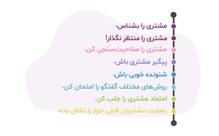 - مشتریان خود را بشناسید: بعضی از فروشندگان فکر میکنند همه مشتریان آنها، خریدار محصولشان هستند. اما اینطور نیست. یک فروشنده حرفهای تلاش میکند که علاقهمندی مشتریانش را پیدا کند، توجه او را به محصول خودش جلب کند و در نهایت برای تصمیمگیری مشتری دربارۀ خرید محصول به او کمک کند.